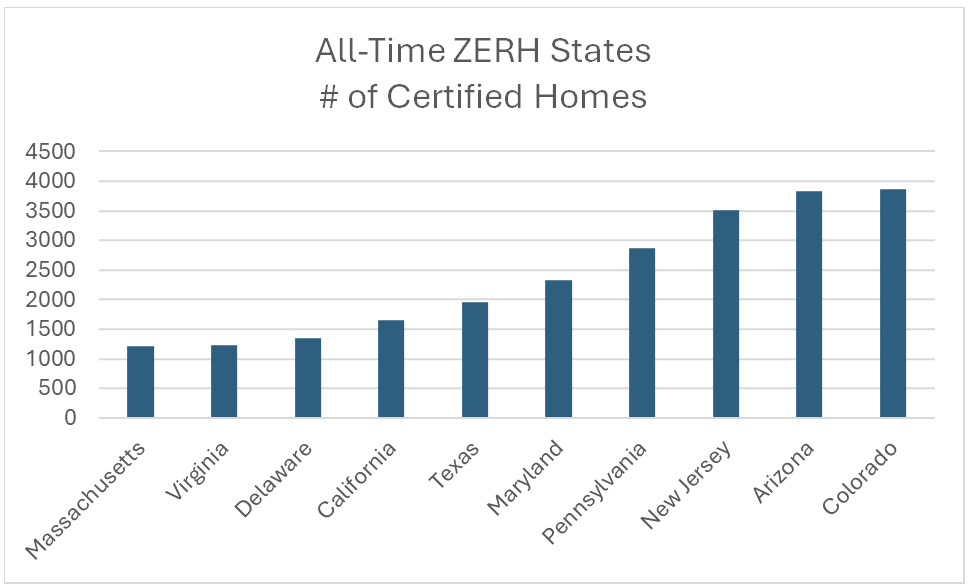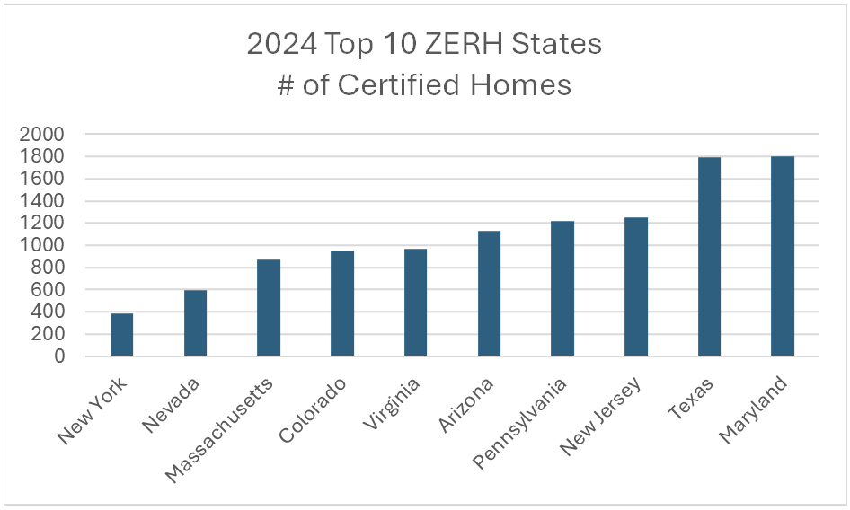 Maryland (1,800) and Texas (1,792) led the way with the most certified ZERH homes in 2024. New Jersey (1,253), Pennsylvania (1,222) and Arizona (1,132) all topped the previous record number of certifications for a state set by New Jersey in 2023 (1,081).