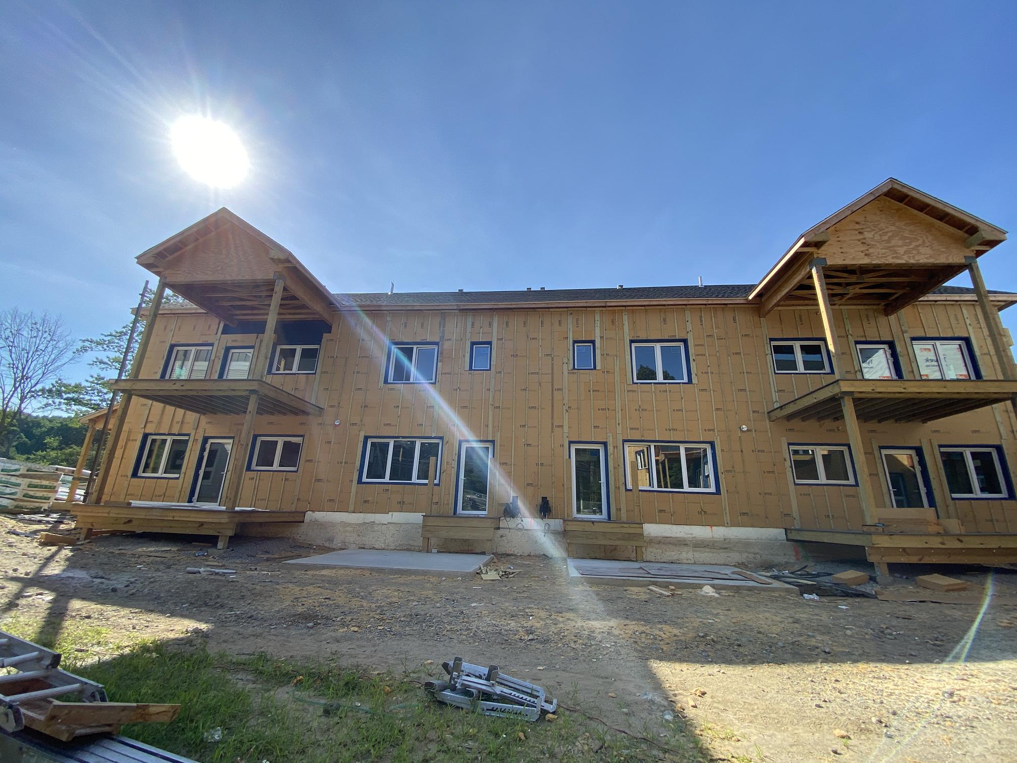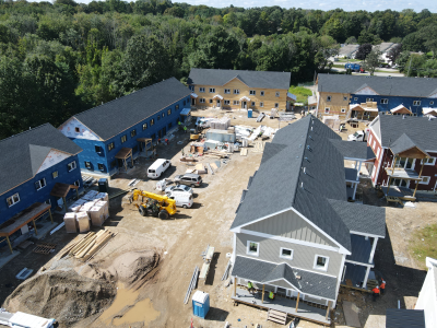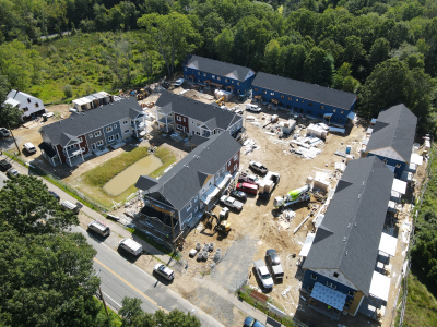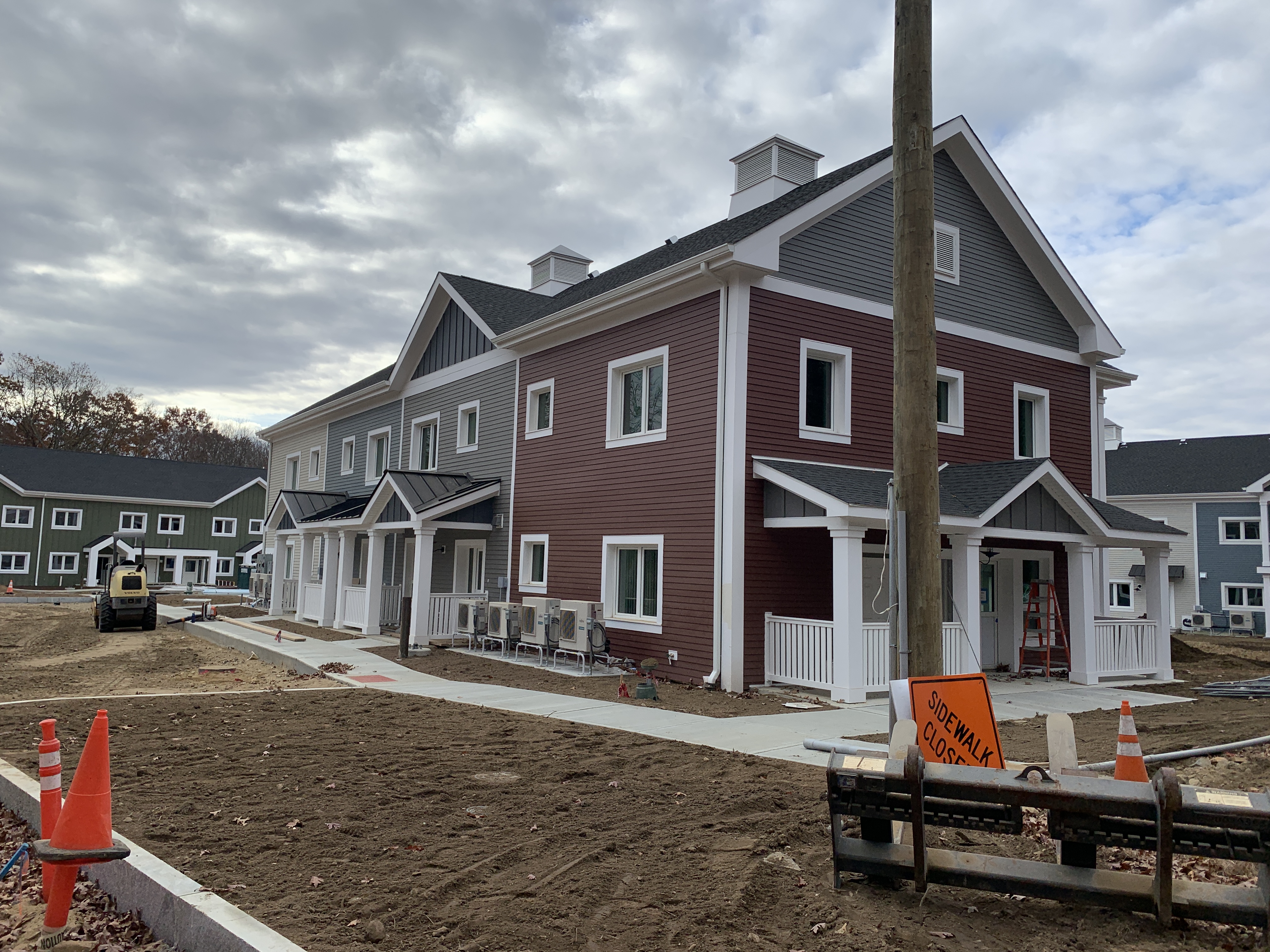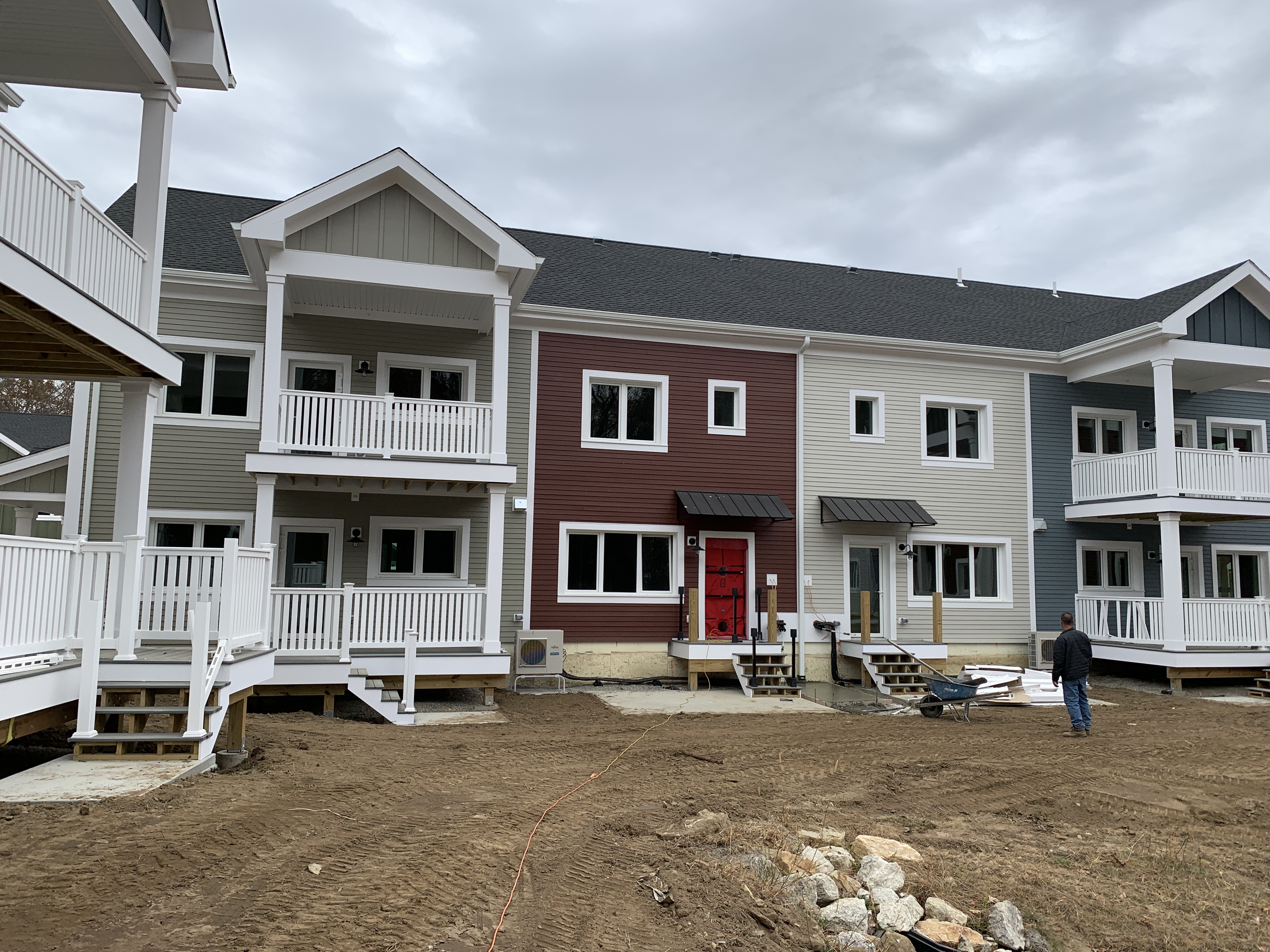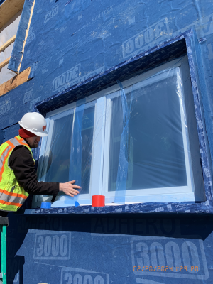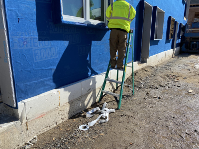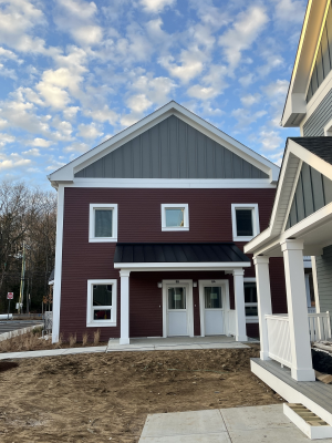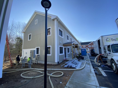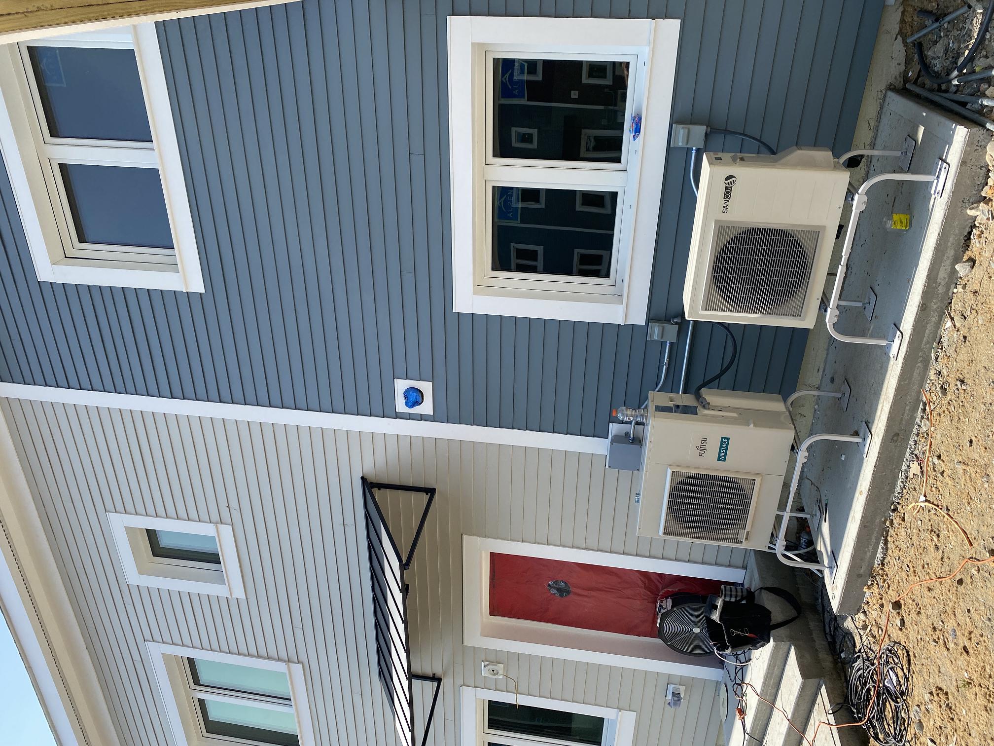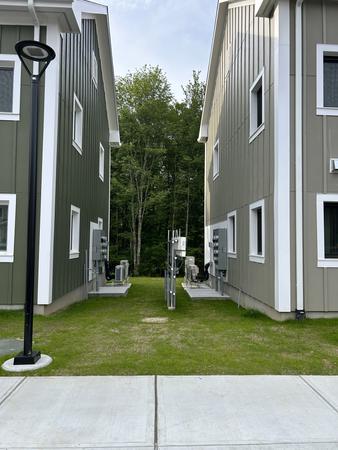 Eagleville Green consists of seven newly constructed buildings with 41 affordable dwelling units. PHIUS Zero certification is pending. While design decisions focused on program requirements, the team also prioritized low emitting, durable products with low embodied carbon. Rigorous oversight included: plan and specification reviews, multiple modeling iterations, on-site verification, on-site preliminary testing for window infiltration, building air infiltration, and assembly connections. These all-electric buildings include Fujitsu non-ducted Heat Pumps, Zehnder ComfoAir350 ERV's, and Sanden Eco2 Heat Pump Water Heaters. While the individual entrances evoke a community feel, each home has its own front and back porch, they pose a challenge for whole building air infiltration testing. To meet this PHIUS+ requirement, the project team cut openings from one unit to the next and disconnected the in-unit ERV’s. Once the whole building tests are complete, the team patched the openings and Steven Winter Associates (SWA) raters completed the compartmentalization testing of each unit. ERV’s were then reconnected, balanced, and ventilation was final tested.