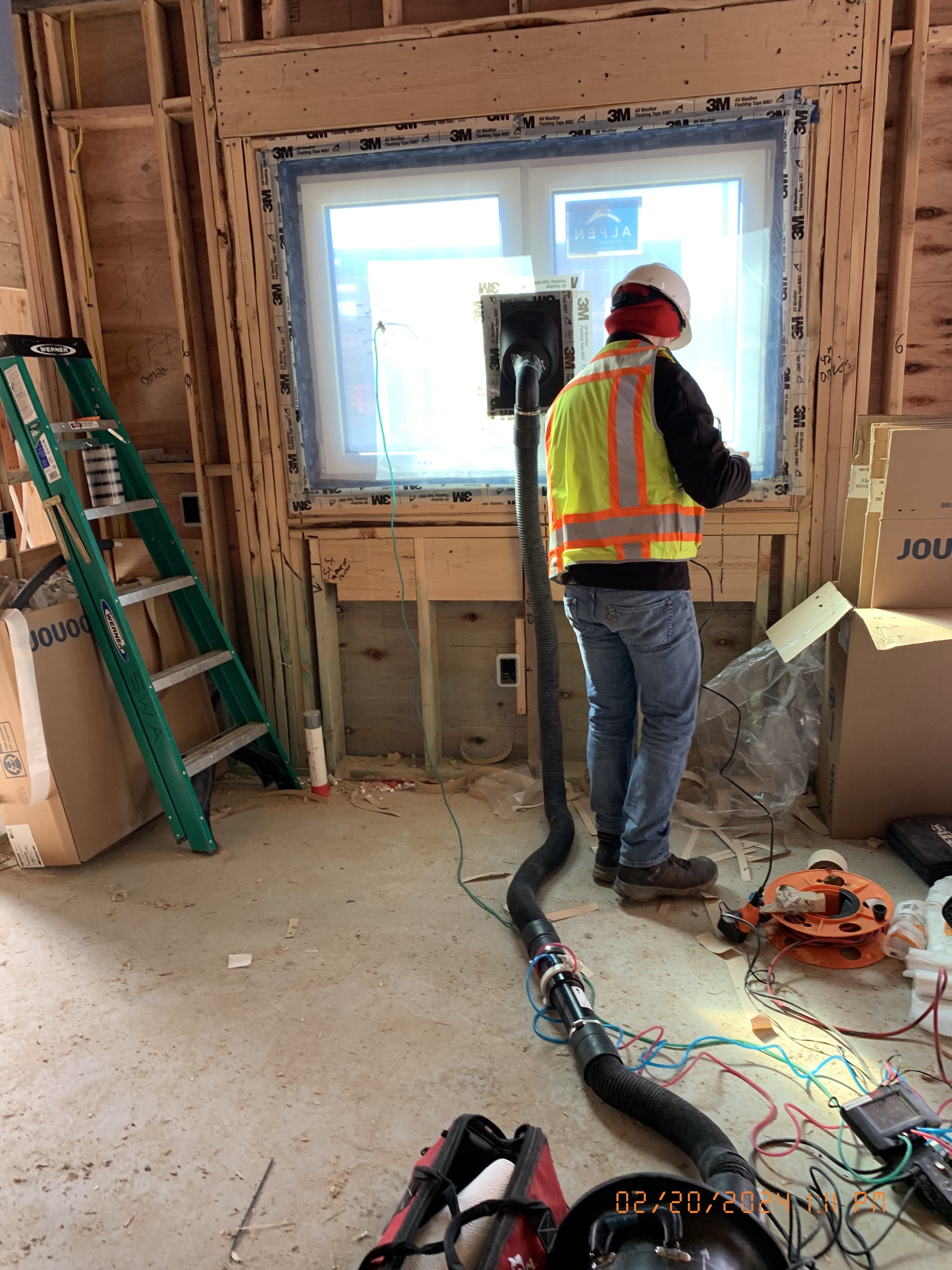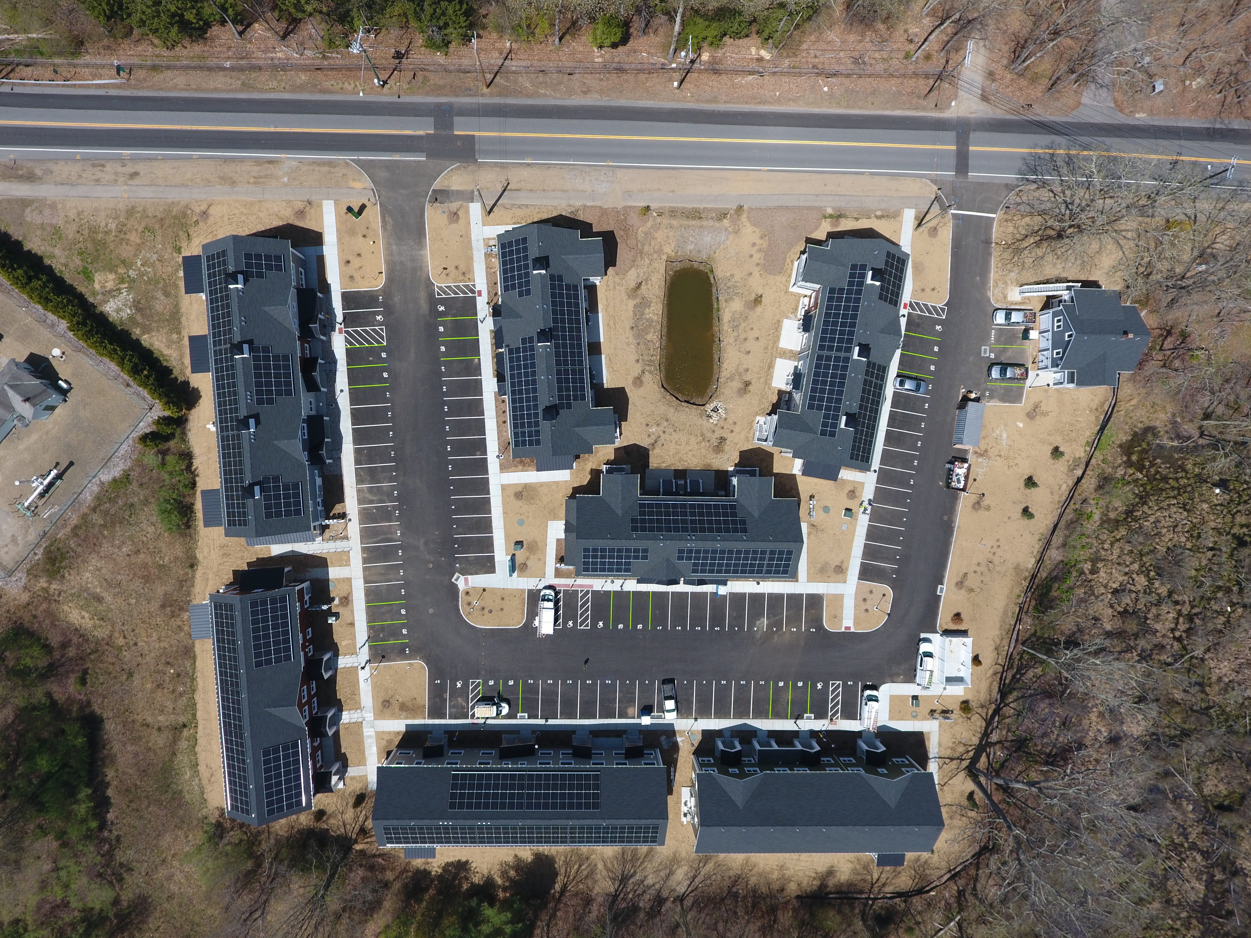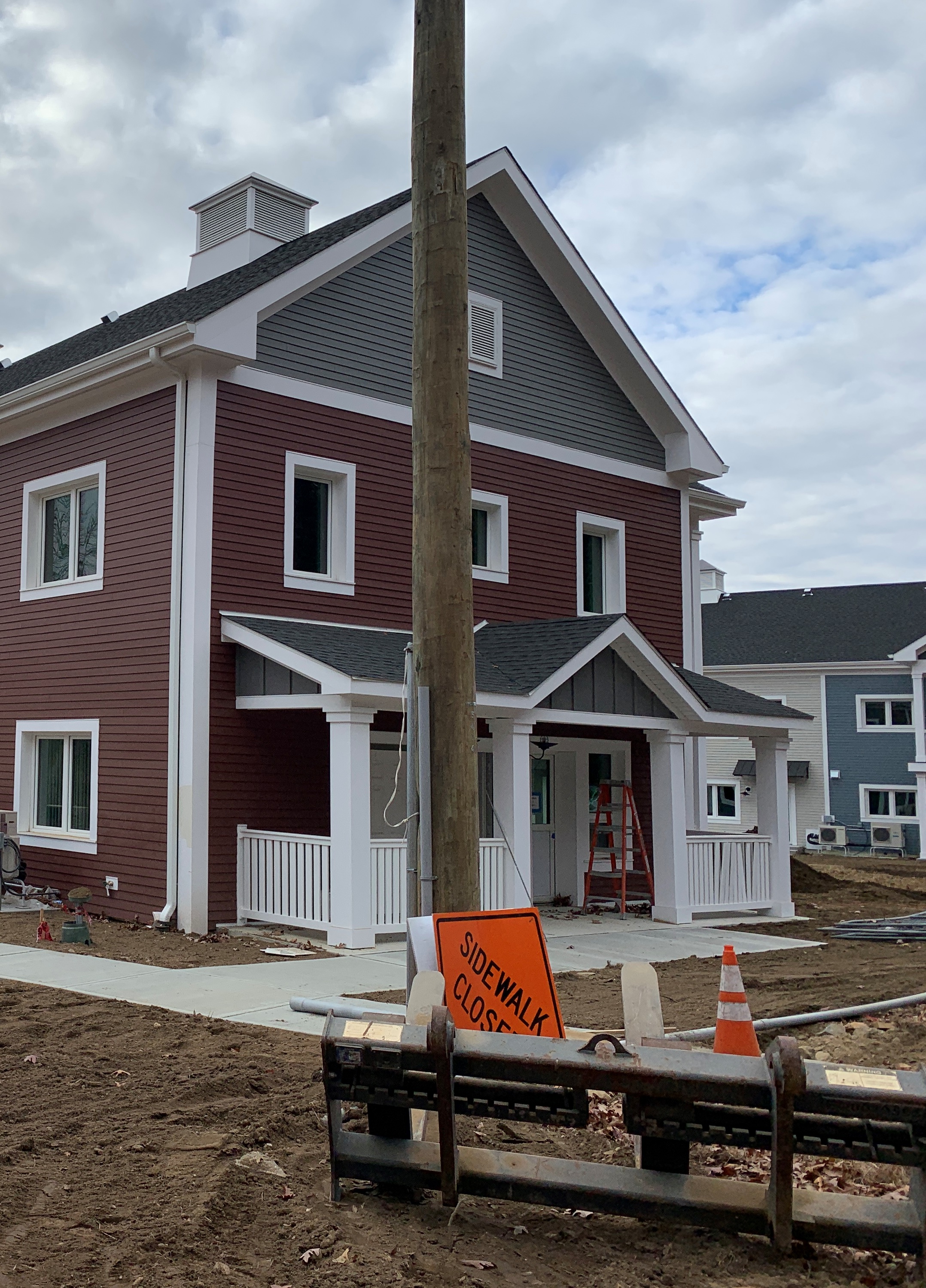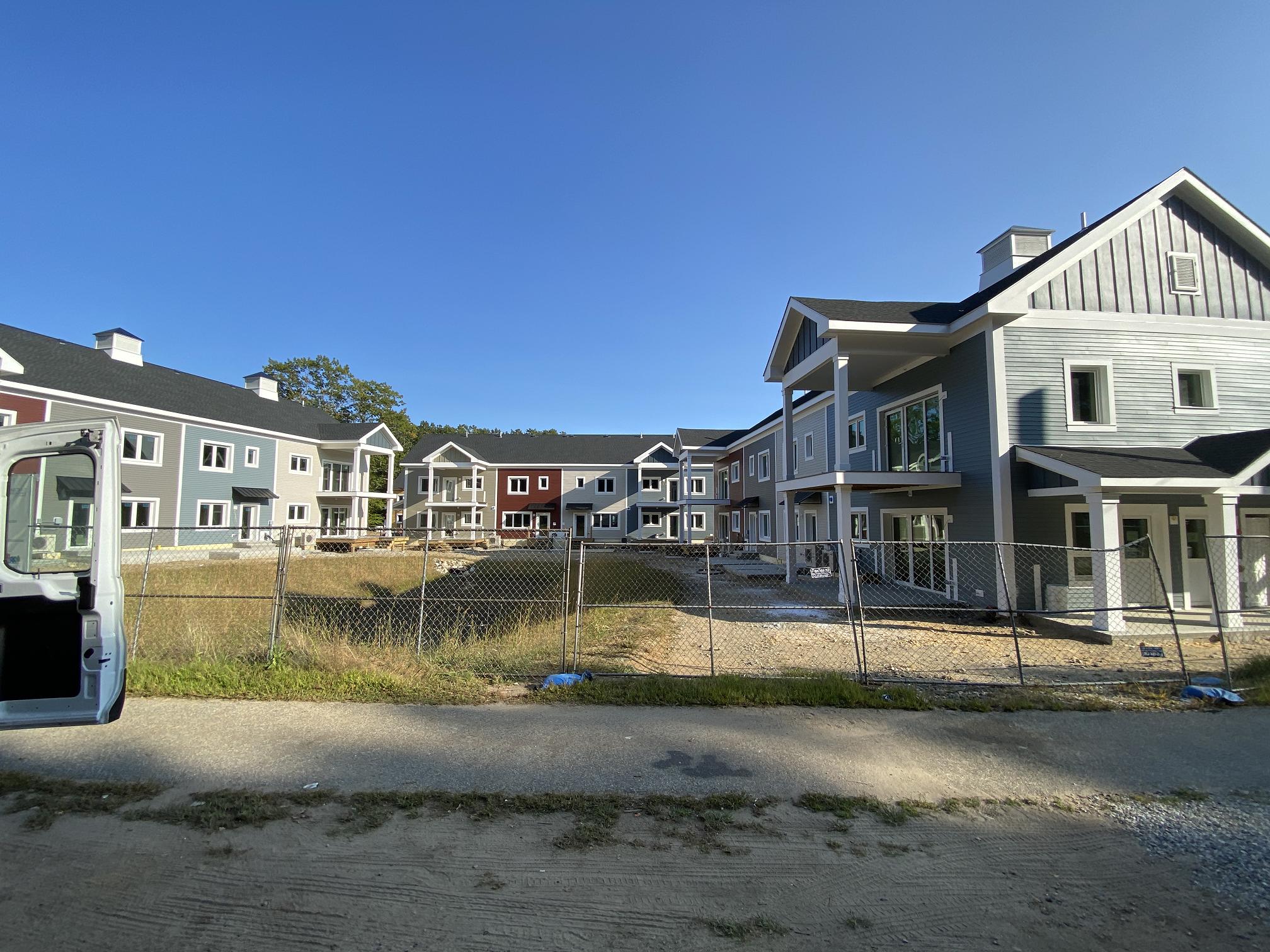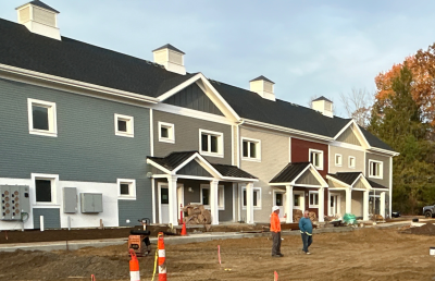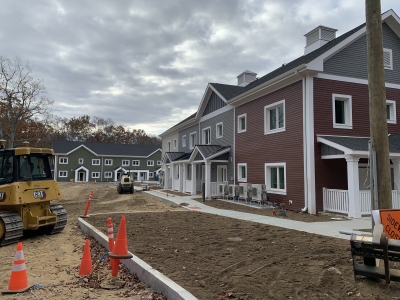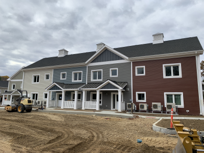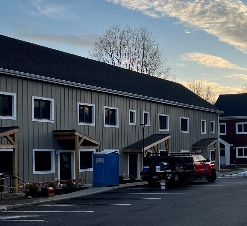 Eagleville Green consists of seven newly constructed buildings with 41 affordable dwelling units. PHIUS Zero certification is pending. While design decisions focused on program requirements, the team also prioritized low emitting, durable products with low embodied carbon. Rigorous oversight included: plan and specification reviews, multiple modeling iterations, on-site verification, on-site preliminary testing for window infiltration, building air infiltration, and assembly connections. These all-electric buildings include Fujitsu non-ducted Heat Pumps, Zehnder ComfoAir350 ERV's, and Sanden Eco2 Heat Pump Water Heaters. While the individual entrances evoke a community feel, each home has its own front and back porch, they pose a challenge for whole building air infiltration testing. To meet this PHIUS+ requirement, the project team cut openings from one unit to the next and disconnected the in-unit ERV’s. Once the whole building tests are complete, the team patched the openings and Steven Winter Associates (SWA) raters completed the compartmentalization testing of each unit. ERV’s were then reconnected, balanced, and ventilation was final tested.