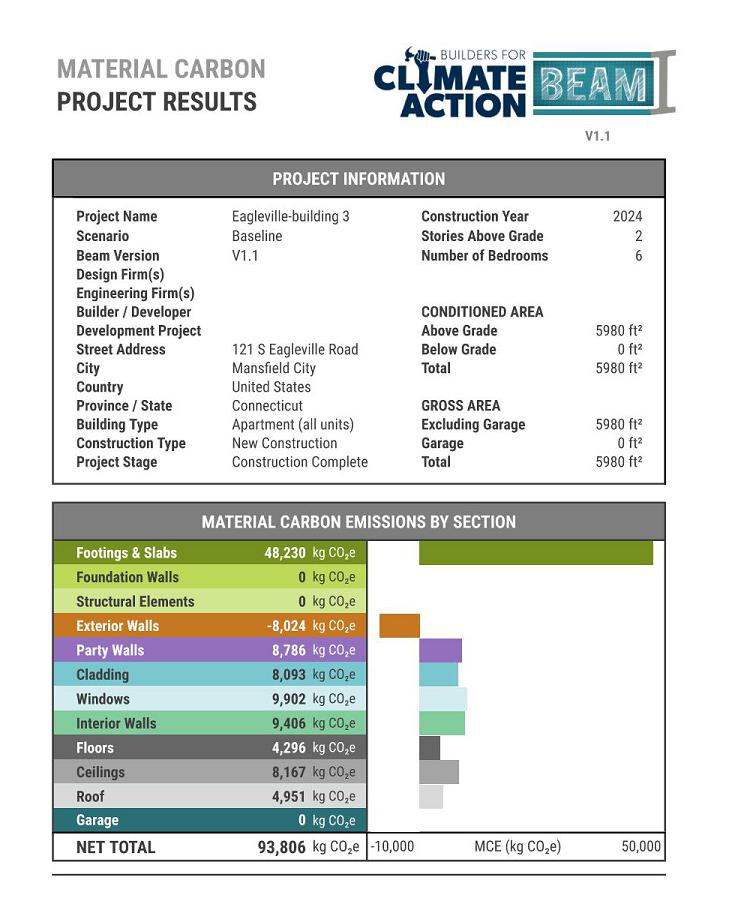 SWA utilized the BEAM tool to inform product choices and to predict embodied carbon emissions. Building three with six-units and eight-bedrooms produces 93,806 kg CO2e or 178 kg CO2e/m2. This is about 15% less than the average reported by RMI for a new home (184 kg CO2e/m2) . Also contributing to the team’s goals to reduce embodied carbon, the existing building on the Eagleville Green site was completely renovated, rather than demolished, to house another apartment over an office and maintenance area.