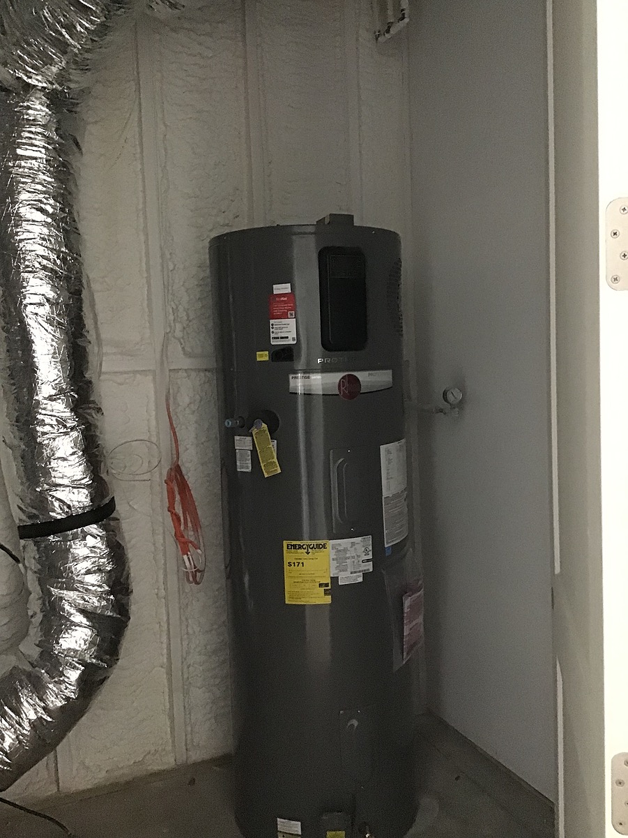 An 80-gallon Rheem heat pump water heater - with a recirculation loop and aqua stat sensor - delivers hot water quickly without waste.