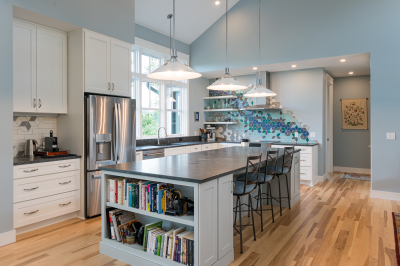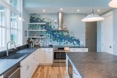 A custom mercury mosaic tile backsplash nods to the movement of the river - and to the creativity that flows through this home.