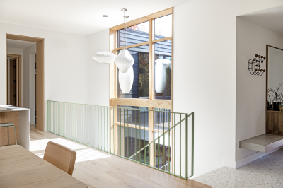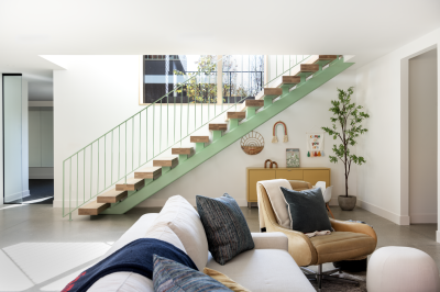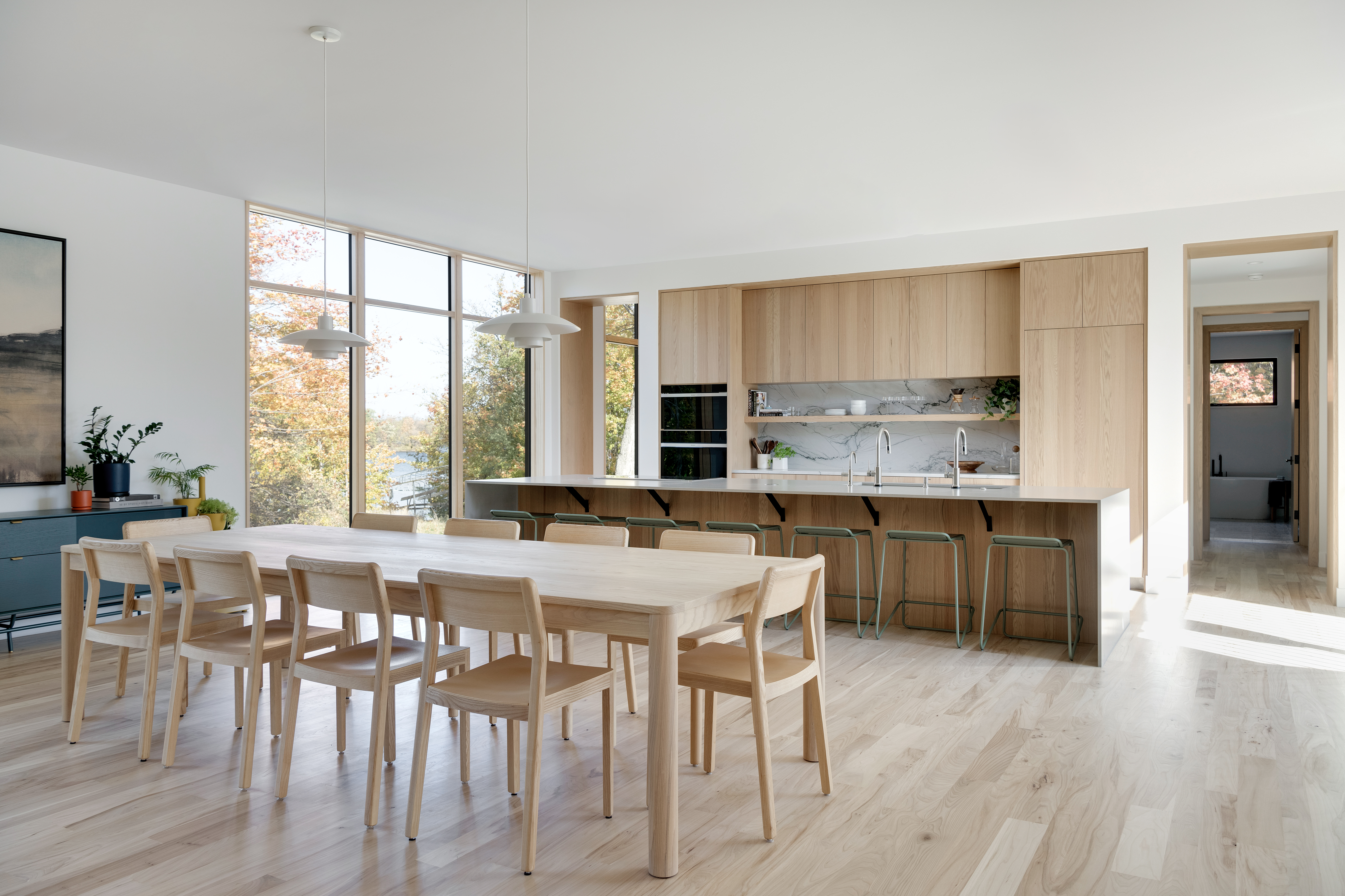 Geothermal HVAC, in-floor hydronic heating, and a balanced ERV system ensure year-round comfort and clean air. Energy-efficient LED lighting, locally sourced thermally modified siding and kitchen hardware, and low-VOC materials—including Silestone countertops and cabinetry—reflect thoughtful, regional craftsmanship. Custom wood furnishings, like the dining table, bring warmth to the interiors.