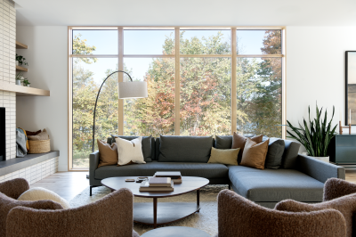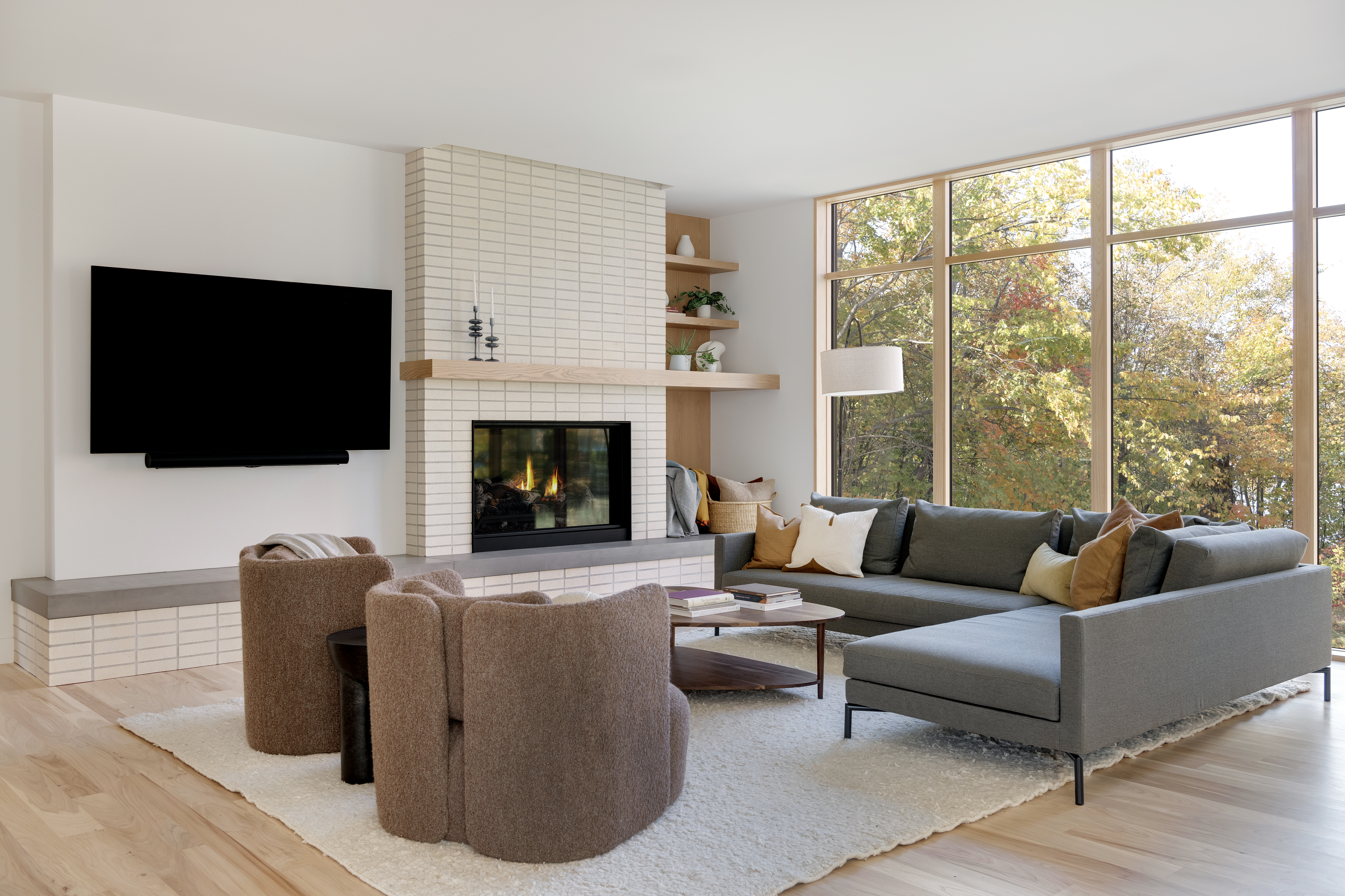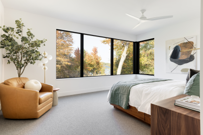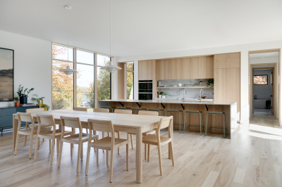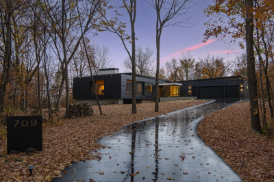 The Lake O’Dowd Residence pairs mid-century modern design with high-performance sustainability. At 6,800 sq ft, the home features triple-pane windows, R-50 cellulose roof insulation, and R-34 spray foam walls—projected to save over $8,000 annually on utilities.