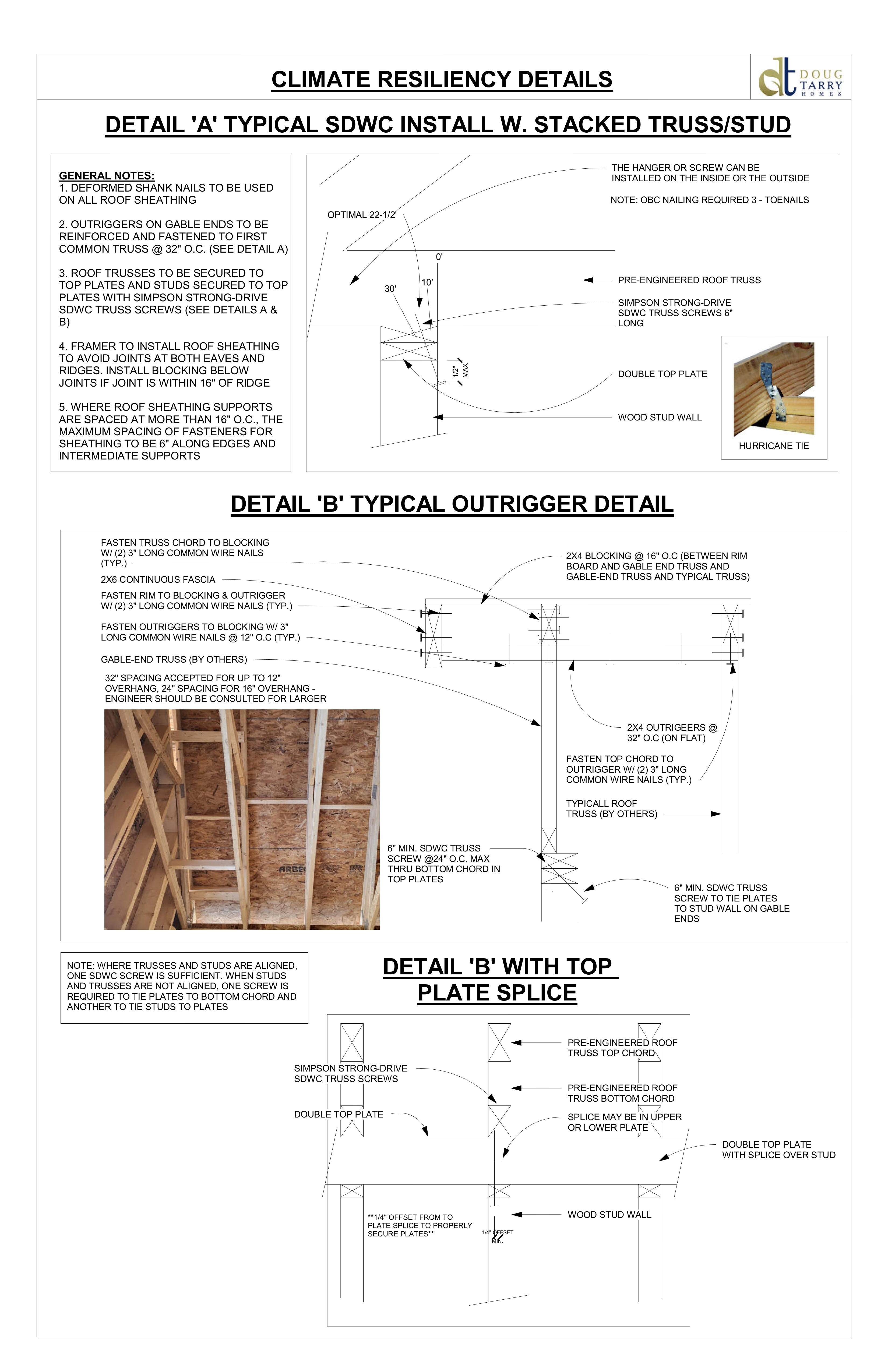 At Doug Tarry Homes, we build with the future in mind—prioritizing resiliency to protect homeowners from increasingly extreme weather events. While Canada does not participate in the FORTIFIED program, we voluntarily implement advanced, research-backed construction practices that exceed code and anticipate future climate conditions.In partnership with the Institute for Catastrophic Loss Reduction (ICLR) and researchers at Western University, we’ve developed enhanced wind-resistance strategies to better protect our homes from high wind events, including EF2 and EF3 tornadoes. This includes the use of 6-inch Simpson Strong Tie SDWC screws to anchor the top plates of exterior walls directly into the roof trusses. These screws provide a stronger mechanical connection than traditional toe-nailing methods, creating a continuous load path from the roof to the foundation and helping the roof system resist uplift forces during extreme storms. We also use 2½-inch ring shank nails for roof sheathing, with 4" O.C. nailing along perimeter edges and 6" O.C. in the field, further increasing resistance to wind uplift and delamination. In gable ends, tie-back rafters are installed to secure the ladder framing to the second roof truss, reinforcing a historically vulnerable part of the structure.