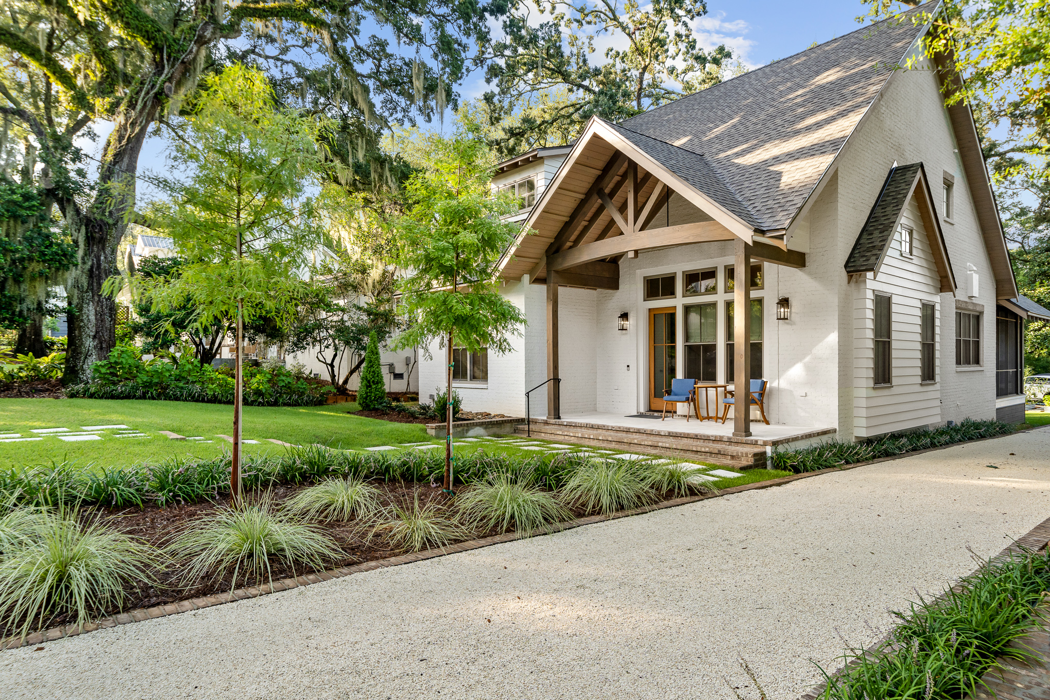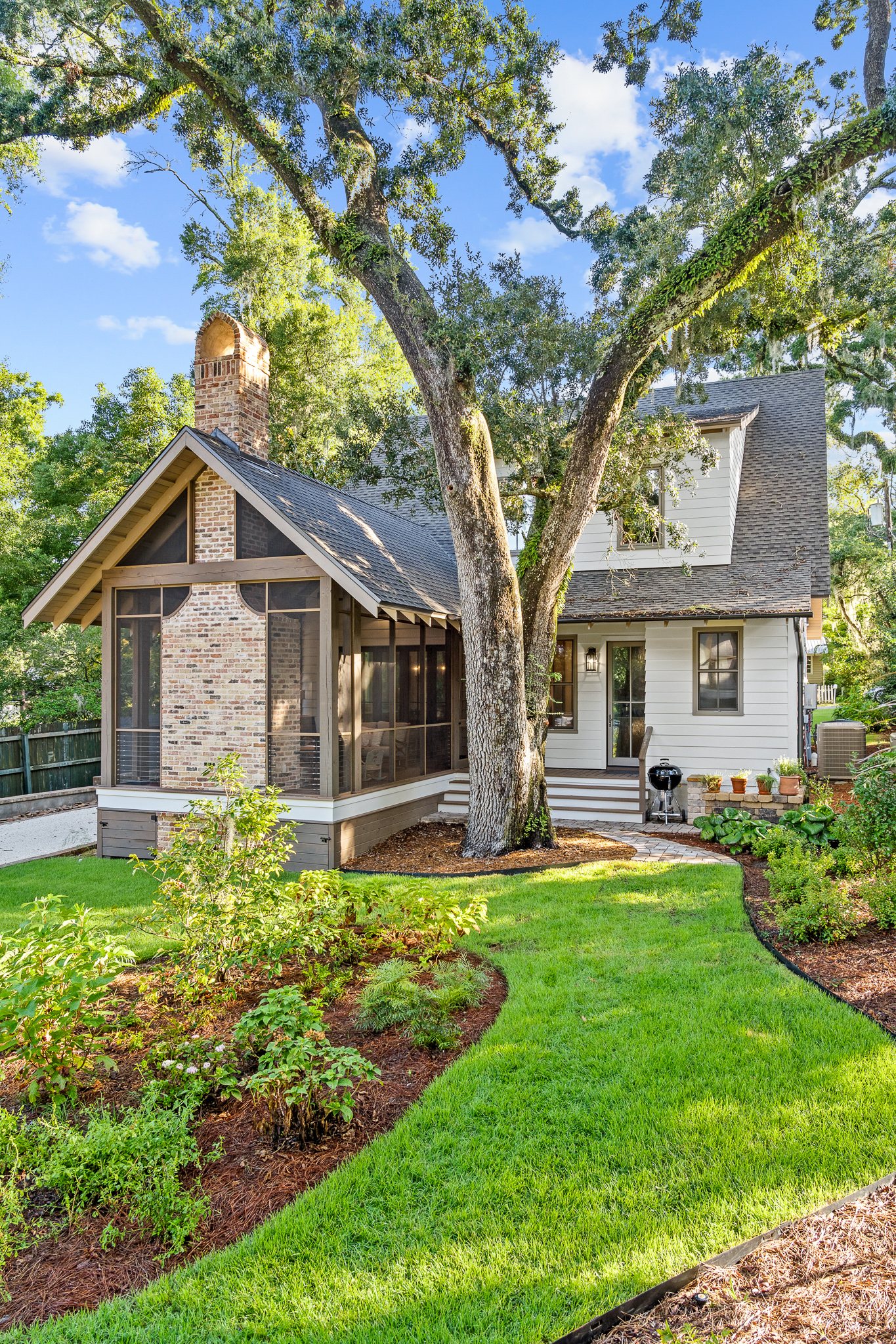 The owners wanted to downsize and simplify in their retirement, but still easily host family and friends for gatherings or long stays. The house, porch, and outbuilding gather around and tuck under a large live oak in the backyard. A master arborist consulted during design and construction to minimize root damage during construction and support the tree’s ongoing health. The home is compact, but outdoor living spaces and a garage workshop expand the usable living area beyond the conditioned spaces. An entry porch provides a cozy perch to enjoy a glass of wine and greet neighbors and passersby. Glass doors extending across one wall of the dining room can fold open to completely dissolve the wall between the dining area and screened porch. The screened porch provides a complete second living room with a fireplace, tv, bar, and comfortable seating overlooking a grilling patio, kitchen garden, and the live oak tree. The owners are pleased that the ease of indoor outdoor living let them comfortably downsize without oversizing their home to accommodate a few special events a year. The outdoor living spaces are their favorite aspect of the house.