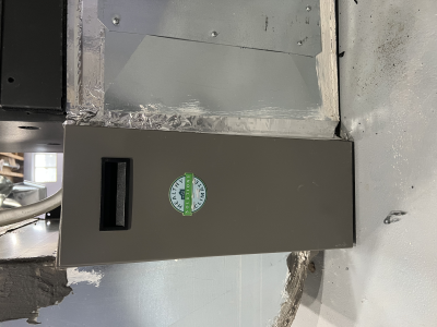 - Duct-mounted IAQ sensor for real-time monitoring of particulates, CO, CO2, and VOCs.